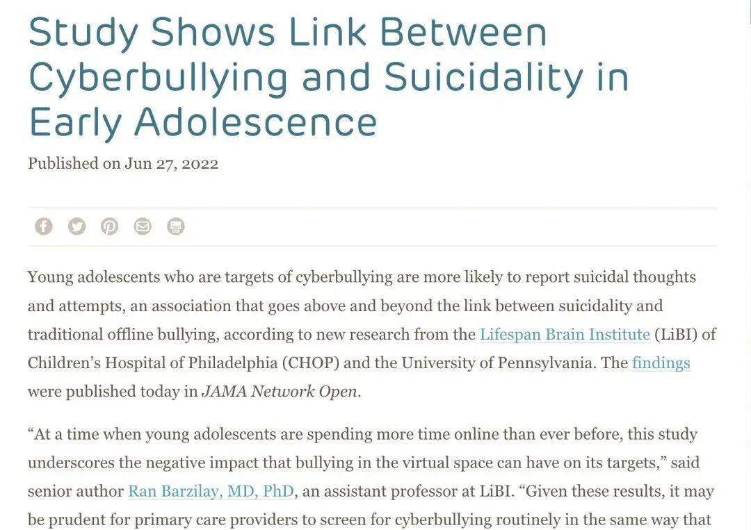 美国某中学正在校生就筹谋和拍摄了对同窗的袭击视频,上传到TikTok和Instagram等平台后激发大波人的关心。皮尤研究核心2022年4月进行的一项查询拜访也显示,46%的13至17岁的美国青少年已经历过至多6种收集行为中的一种!加害者认为本人不会被抓住,就算抓住了也可能仅仅当做是同窗或伴侣间的打趣,行为并不会遭到或赏罚。中小学阶段恰是成长的环节期,身处漩涡中的学生,轻则逃学,沉则呈现抑郁、焦炙情感,以至或。结合国儿童基金会一项新查询拜访显示,30个国度的三分之一的年轻人暗示本人是收集的者,此中五分之一的人因收集和而逃学。